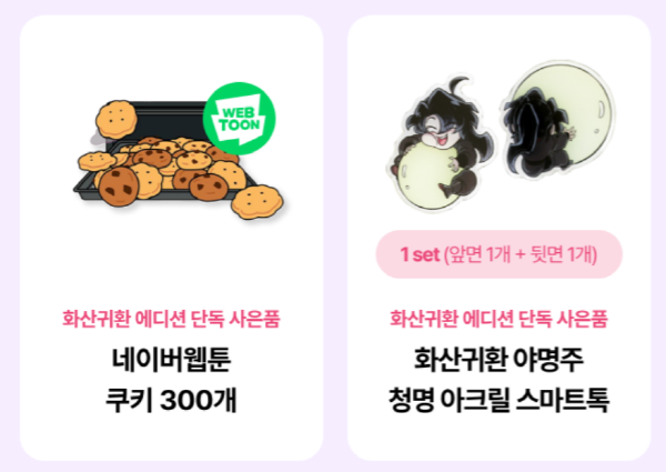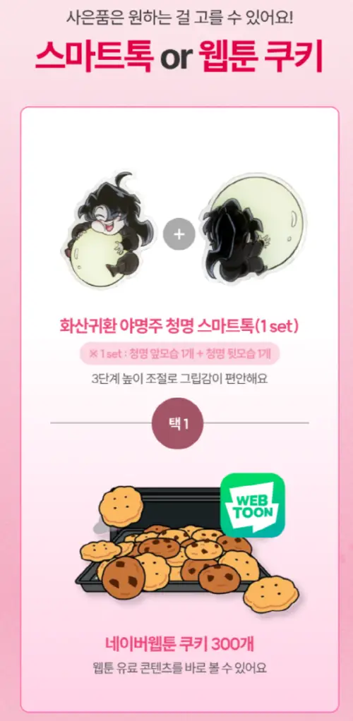 스마트톡이나 웹툰 쿠키 중에 1가지를 선택하실 수 있습니다.