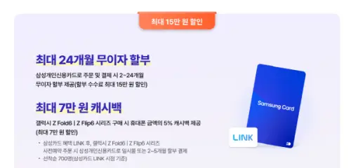24개월 무이자 할부 또는 최대 7만원 캐시백을 제공합니다.