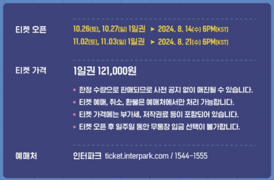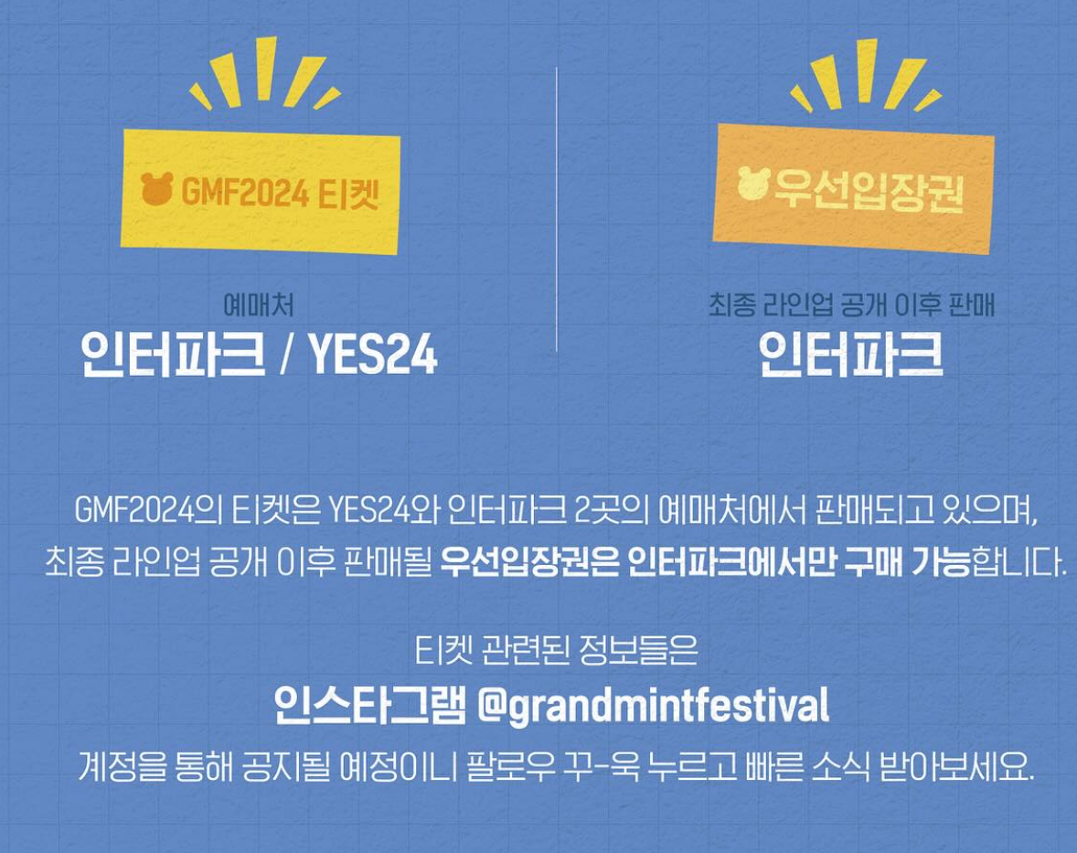 티켓이 빠르게 매진될 수 있으니, 가능한 빠르게 예매를 하시는게 그랜드 민트페스티벌 2024를 즐길수 있는 방법입니다.