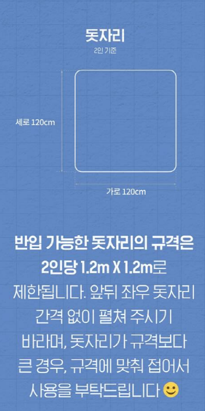 돗자리 사용 가능: 공연 관람 시 편안한 관람을 위해 돗자리 사용이 가능하나, 대형 돗자리는 제한되며 주위 사람들에게 불편을 주지 않도록 해주세요.
