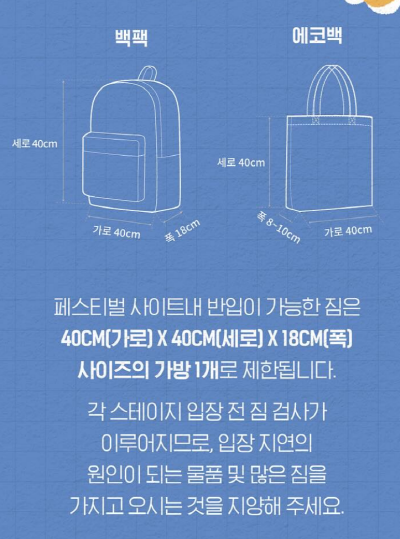 대형 의자 및 텐트: 관람 시 방해가 될 수 있는 대형 물품, 텐트, 파라솔 등의 반입이 금지됩니다.