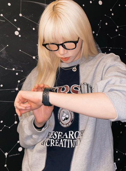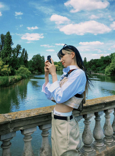 크롭 셔츠와 멜빵 느낌의 베스트로 얇은 허리를 드러내고 하의 언더웨어를 살짝 노출해 힙한 느낌을 더했습니다.