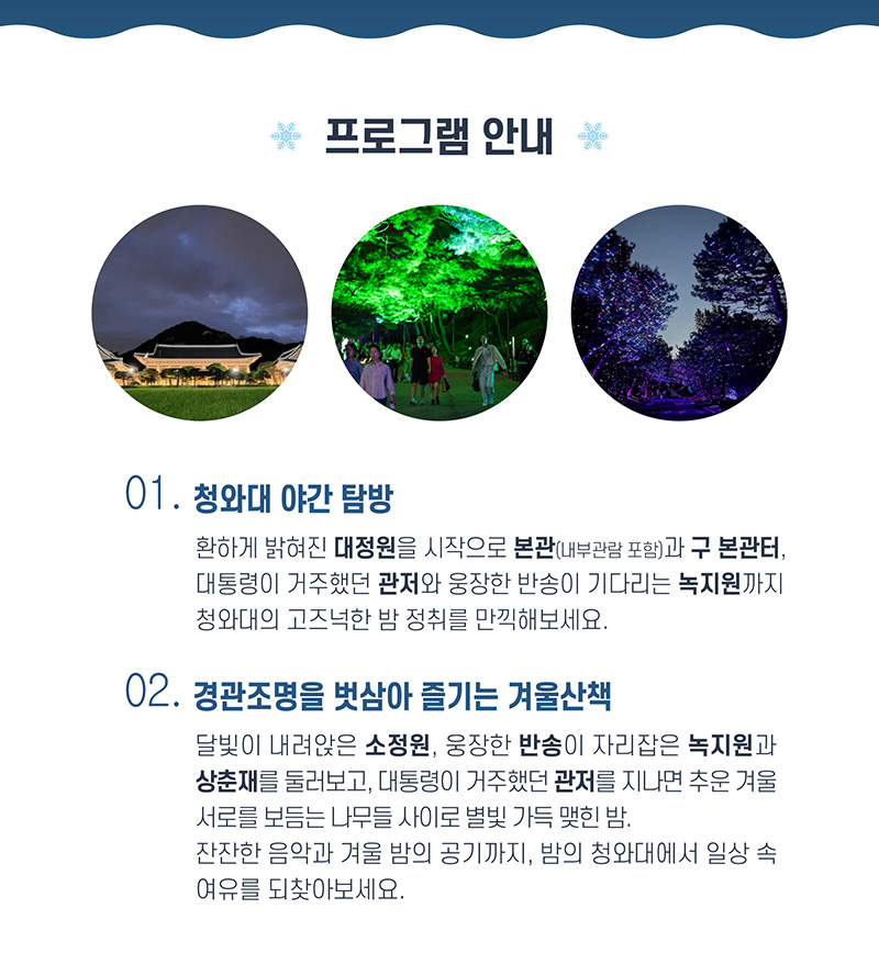 잔잔한 음악과 겨울밤의 공기까지, 밤의 청와대에서 일상 속 여유를 되찾아보세요.