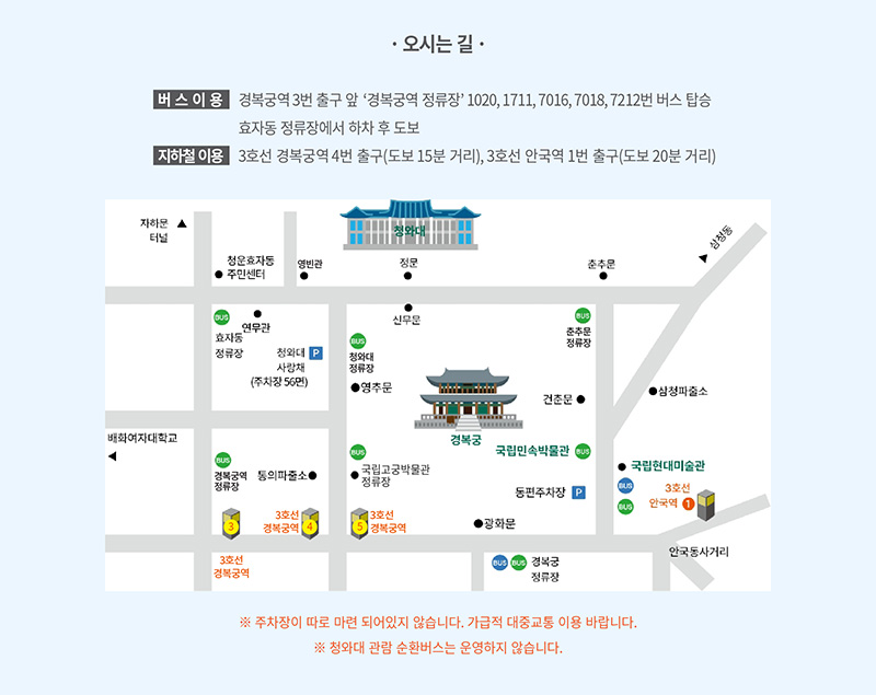 경복궁역 3번 출구 앞 '경복궁역 정류장' 1020, 1711, 7016, 7018, 7212번 버스 탑승 효자동 장류장에서 하차 후 도보