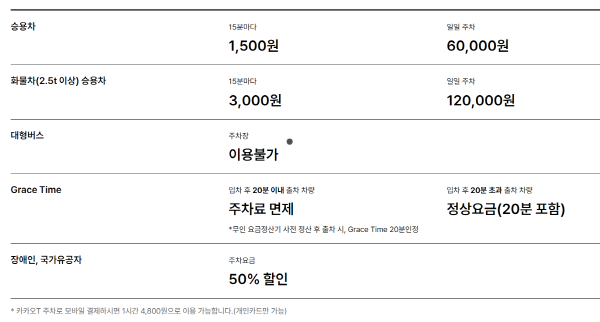 | 승용차 | 15분마다 1,500원 | 일일주차 60,000원 |
