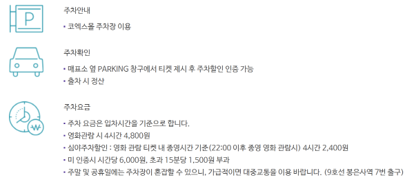코엑스 내에 위치한 메가박스 영화관을 이용해 주차 할인을 받을 수도 있습니다.