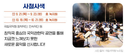 사철사색은 국악관현악의 창작곡을 중심으로 하는 특별한 공연입니다. 10월 19일부터 21일까지 녹지원에서 진행되며, 국립국악원 창작악단, 민속악단 등의 연주를 감상할 수 있습니다.