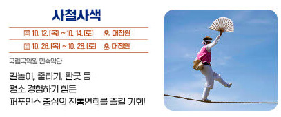 그리고 이어지는 10월 26일부터 28일까지의 사철사색에서는 길놀이, 줄타기, 판굿 등의 전통 연희 퍼포먼스를 만끽할 수 있습니다.